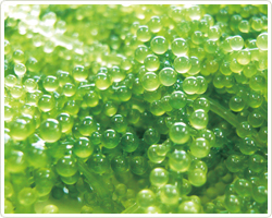 人気の特産品!食感に感激・絶賛まちがいなし!ぶどうの房のような形状から海ぶとうと呼ばれています。たんぱくな風味とプチプチした歯ごたえが特徴で噛むと塩気の汁が口のなかではじけます。